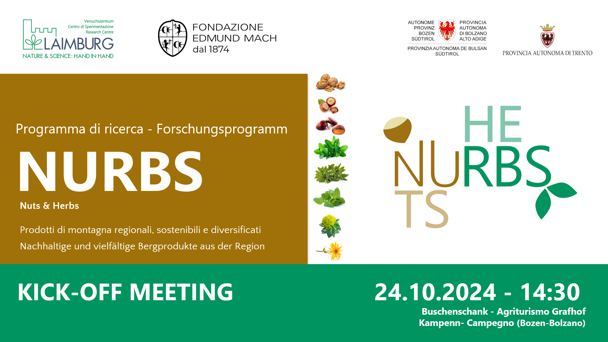 Kickoff meeting del progetto "Nuts&Herbs" - NURBS, finanziato da Laimburg, Fondazione E. Mach, Provincie autonome di Trento e di Bolzano, per la valorizzazione di frutta a guscio ed erbe alimientari di provenienza regionale. La partecipazione all'evento è su invito.